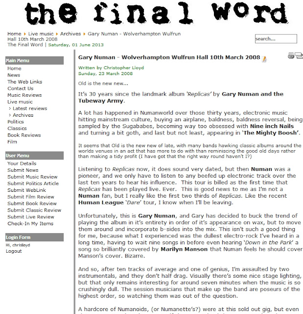 Gary Numan - Wolverhampton Wulfrun Hall, 10th March 2008. Get link Facebook X Pinterest Email Other Apps March 10, 2008 Gary Numan - Wolverhampton Wulfrun Hall, 2008. Full Review, Click Here Read more